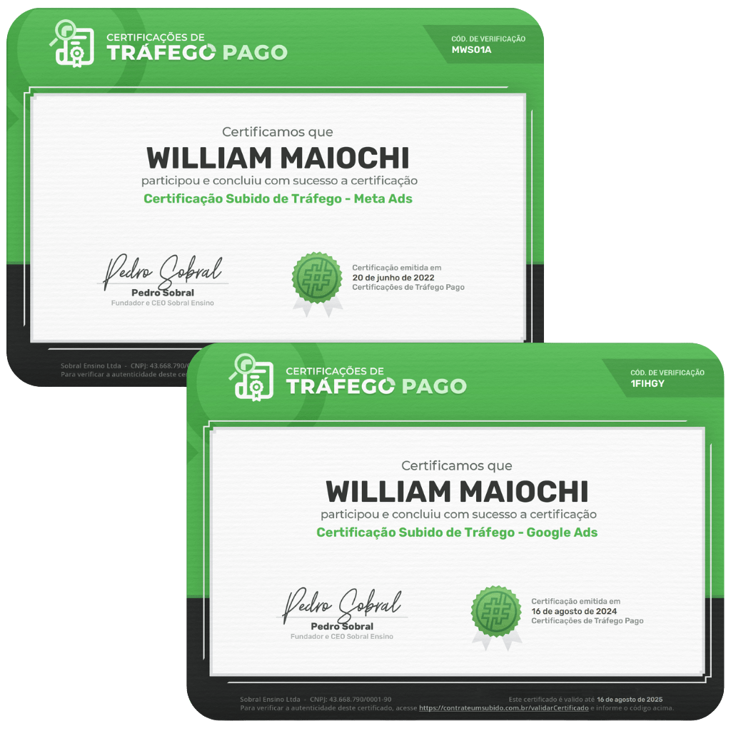 Eu sou William Maiochi, fundador da WMD Mídias, com experiência desde 2017. Sou certificado pela comunidade Sobral de Tráfego, fui aluno do Fórmula de Lançamento e d’O Novo Mercado.